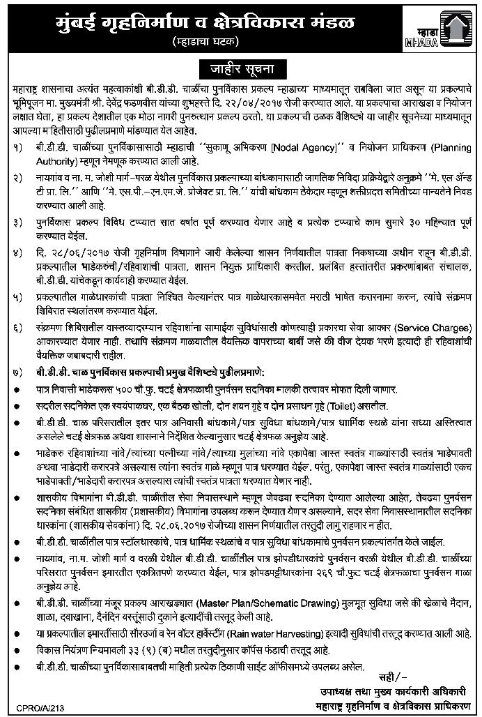 - Environmental Clearance for Proposed Redevelopment of Bombay Development Directorate (BDD) Chawls at CTS No. 1539 & 1540 Lower Parel, Worli, Mumbai, Maharashtra by Mumbai Housing and Area Development Board (A regional unit of MHADA)